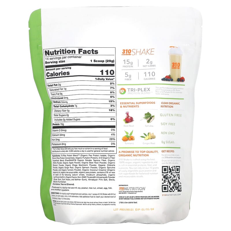 OrganicVeganGMO FreeSoy FreeGluten Free15 g ProteinDrink MixNaturally Flavored2 g Net Carbs5 g Fiber110 Calories0 g Sugar†Clean Organic NutritionTri-Plex Protein Blend™The perfect blend of high fiber plant based proteins (pea, brow rice and pumpkin) for the great taste and texture. Essential Superfoods & NutrientsBeet rootSpirulinaTurmericGinger rootA promise to top-quality, organic nutrition310 Shake is crafted using the best, 100% vegan, organic ingredients and is rich in essential proteins, fiber, and nutrients. You can rely on our 15 grams of easily digestible pure protein and rich superfoods for balanced nutrition and measurable results. †Not a low calorie food.