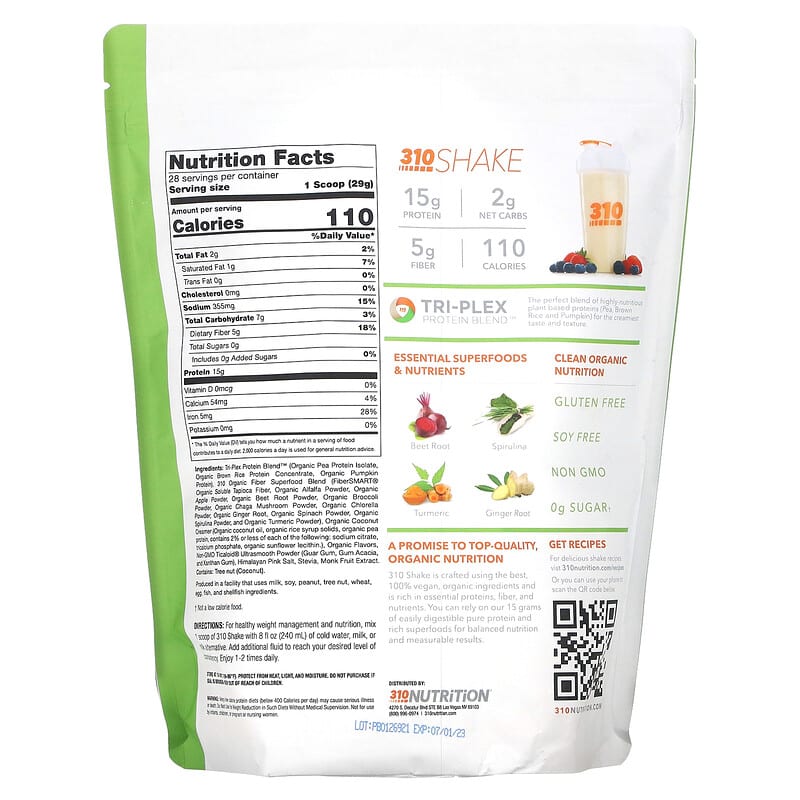 OrganicVeganGMO FreeSoy FreeGluten Free15 g ProteinNaturally FlavoredDrink Mix2 g Net Carbs5 g Fiber110 CaloriesClean Organic Nutrition0 g Sugar†Tri-Plex Protein Blend™ The perfect blend of high fiber plant based proteins (pea, brow rice and pumpkin) for the great taste and texture. Essential Superfoods & NutrientsBeet RootSpirulinaTurmericGinger RootA Promise to Top-quality, Organic Nutrition310 Shake is crafted using the best, 100% vegan, organic ingredients and is rich in essential proteins, fiber, and nutrients. You can rely on our 15 grams of easily digestible pure protein and rich superfoods for balanced nutrition and measurable results. †Not a low calorie diet.