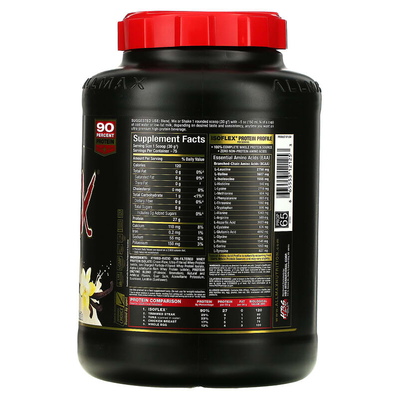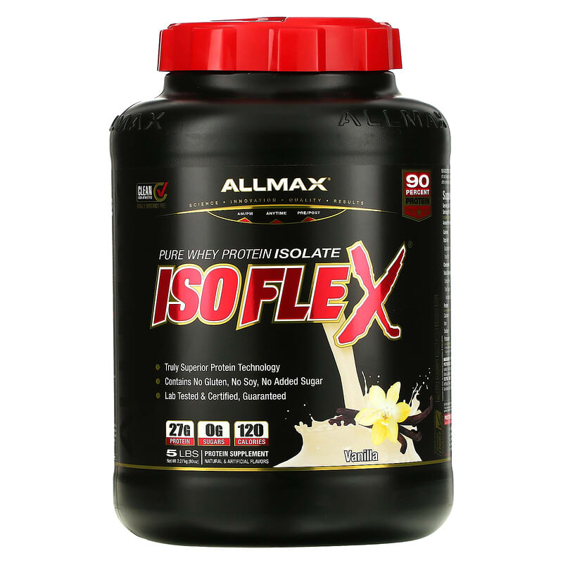 Science – Innovation – Quality – ResultsAM / PM – Anytime – Pre / PostTruly Superior Protein TechnologyContains No Gluten, No Soy, No Added Sugar Lab Tested & Certified, Guaranteed27 g Protein – 0 g Sugars – 120 CaloriesProtein Supplement90 Percent ProteinNatural & Artificial FlavorsTested Free of Banned Substances – Informed-Choice Trusted by SportLab Tested- Every Ingredient Every LotcGMP Certified FacilityGluten FreeKosher DairySoy-FreeIsoflex®: Truly Superior ProteinIsoflex® has taken WPI technology to a whole new level of measurable superiority. Isoflex® is significantly lower in lacrose, fat, sugar and carbs, compared to regular WPIs. If you’re looking for the highest quality, most premium and fastest absorbing protein, then look no further than ISOFLEX®, a Truly Superior Whey Protein Isolate. In just about every way a protein can be, Isoflex® is Truly Superior. What does this mean to you?A 100% Whey Protein Isolate SourceNative & Intact, Non-Denatured Whey Protein FractionsLaboratory-Tested, Certified & Approved 27 g Pure Protein in Every ServingHybrid Ratio Isolate – (HRI)Ion-Filtration TechnologyIsoflex® employs a unique protein extraction technology called HRI. A hybrid of two isolate purification technologies incorporated at a specific ratio to produce a truly superior ultra-pure whey protein isolate. Cutting-Edge Hybrid-Ratio Ion-Filtration (HRI) Technology allows Isoflex to retain an exceptionally high protein yield while maintaining enhanced bioactive whey fractions. Isoflex contains absolutely no whey concentrate. Concentrates have higher levels of fat and sugars with a lower percentage of protein and lower bioavailability than Isolates. While other brands use Concentrates, Isoflex users know that Isolates have a superior protein percentage and won’t settle for non-isolate blends. Unsurpassed The AllMax® Quality GuaranteedEvery ingredient added and every lot produced is laboratory-tested for purity and potency to ensure consistent product quality and integrity every time, guaranteed. Clean for Athletes – Banned Substance TestedThis product has been skip-lot tested for banned substances for the assurance of athletes and supplement users under the Informed Choice program. Protein Comparison
