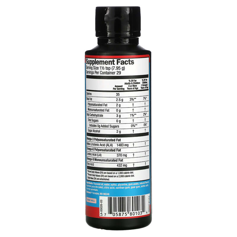 Flaxseed oil, water, xylitol, glycerine, gum arabic, natural flavors, vegetable juice (for color), citric acid, xanthan gum, guar gum, sorbic acid, ascorbyl palmitate.