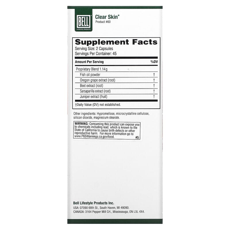 Thành phần có trong Bell Lifestyle Clear Skin 90 Veggie Capsules