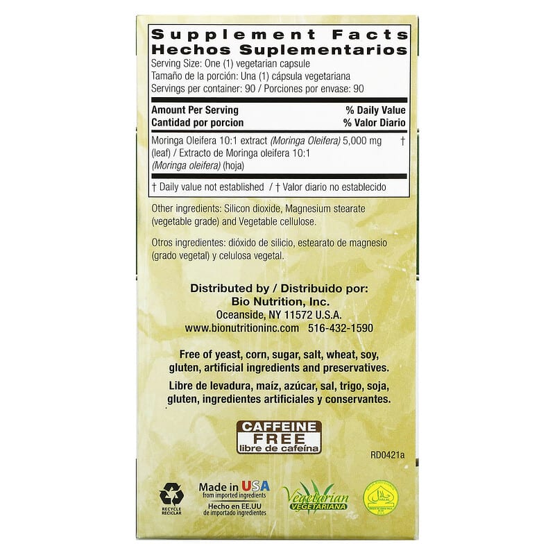 Thực phẩm chức năng Bio Nutrition Moringa 5.000 90 Vegetable Capsules chính hãng nhập khẩu từ Mỹ, Mã vạch 854936003334, Quy cách: 0.11 kg,