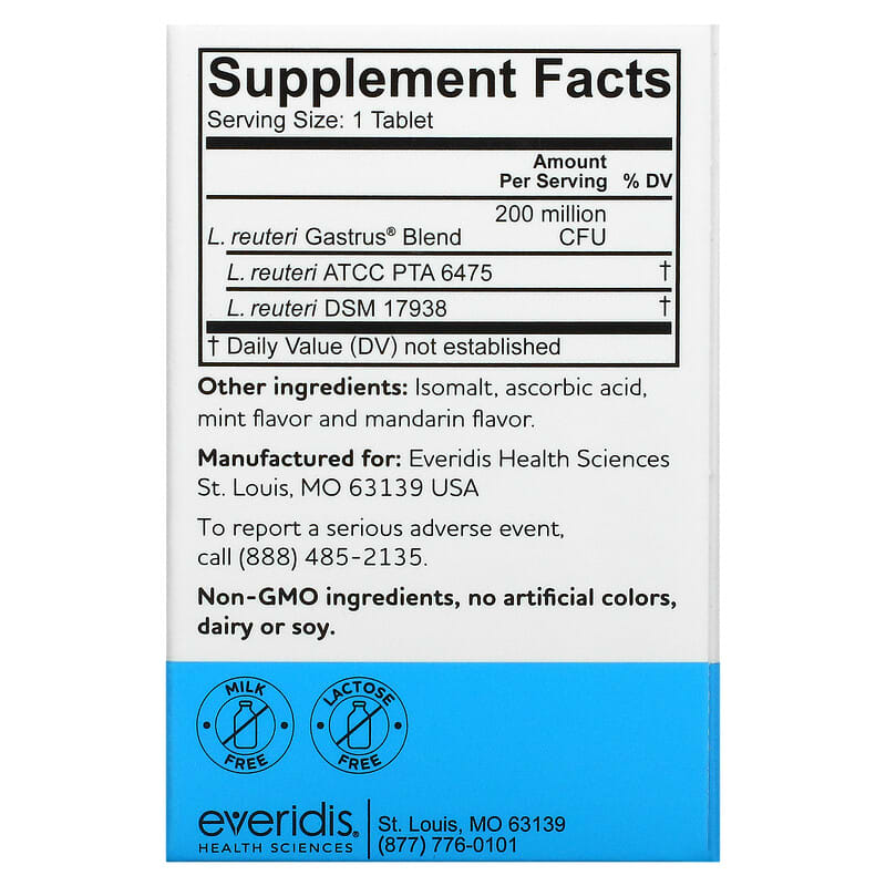 Probiotic SupplementMilk FreeLactose FreeProbiotic Gastrointestinal HealthGroundbreaking Probiotics Driven by ScienceCountry of Origin: SwedenBioGaia® Gastrus® is a Dietary Supplement containing the patented lactic acid bacterium blend Limosilactobacillus** reuteri Gastrus® (L. reuteri DSM 17938 and L. reuteri ATCC PTA 6475) that helps the good microorganisms keep a natural balance in the stomach & the gut. Because both strains in L. reuteri Gastrus naturally colonize humans they have a strong adaptation to persist and interact with humans. L. reuteri Gastrus has been tested in clinical studies and proven effective and safe. ** Previously named Lactobacillus