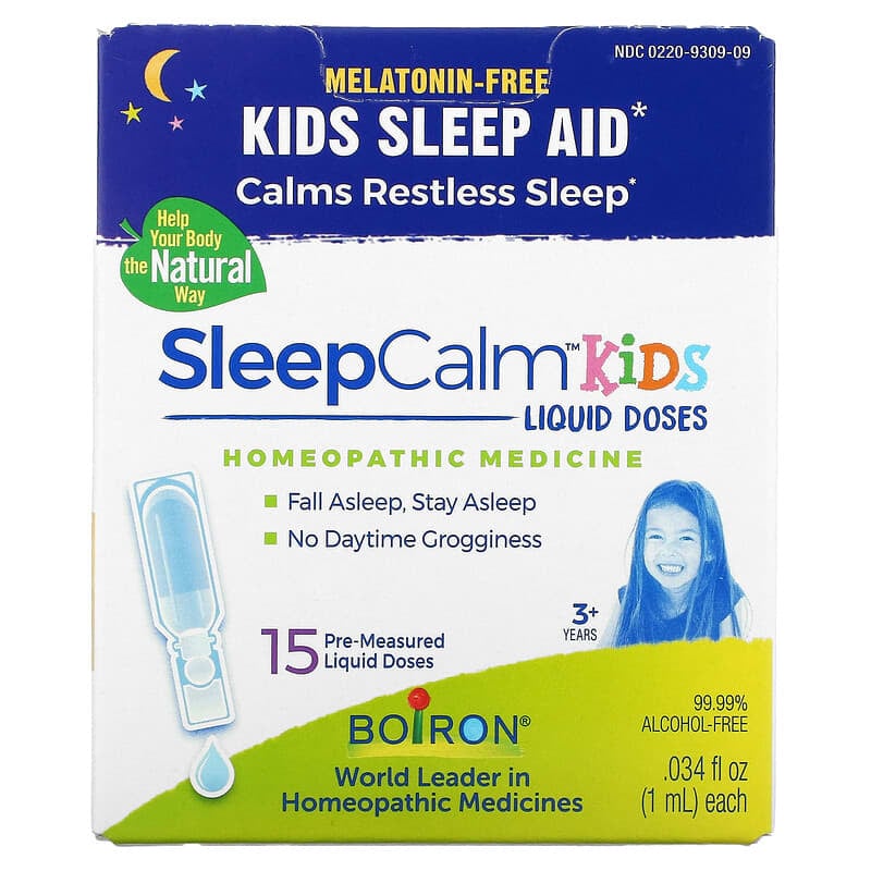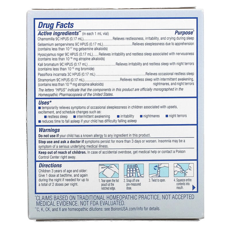 Kids Sleep AidCalms Restless SleepHelp Your Body the Natural WayFall Asleep, Stay AsleepNo Daytime GrogginessWorld Leader in Homeopathic Medicine99. 99% Alcohol-FreeNo Preservatives, Flavors, Dyes or Colors, Lactose, Sugar or Artificial SweetenersA Better WayAt Boiron, we believe there’s a better way to feel better. Since 1932, the Boiron family has been dedicated to providing the purest medicines using sustainable practices. As world leader in homeopathic medicines, quality has always been our passion and your well-being is our goal. The Boiron PromiseYour health deserves the greatest respect. That’s why we’re committed to your satisfaction. Uses: Temporarily relieves symptoms of occasional sleeplessness in children associated with upsets, excitement, and schedule changes such as:Restless sleepIntermittent awakeningIrritabilityNightmaresNight terrorsReduces time to fall asleep if your child has difficulty falling asleep