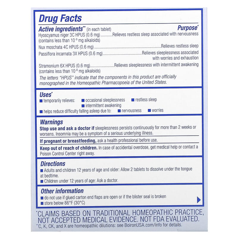 Drug FactsActive Ingredients** (in each tablet)Purpose* Hyoscyamus niger 3C HPUS (0. 6 mg) Relieves restless sleep associated with nervousness Nux moschata 4C HPUS (0. 6 mg)Relieves restless sleep Passiflora incarnata 3X HPUS (0. 6 mg)Relieves sleeplessness associated with worries and exhaustion Stramonium 6X HPUS (0. 6 mg)