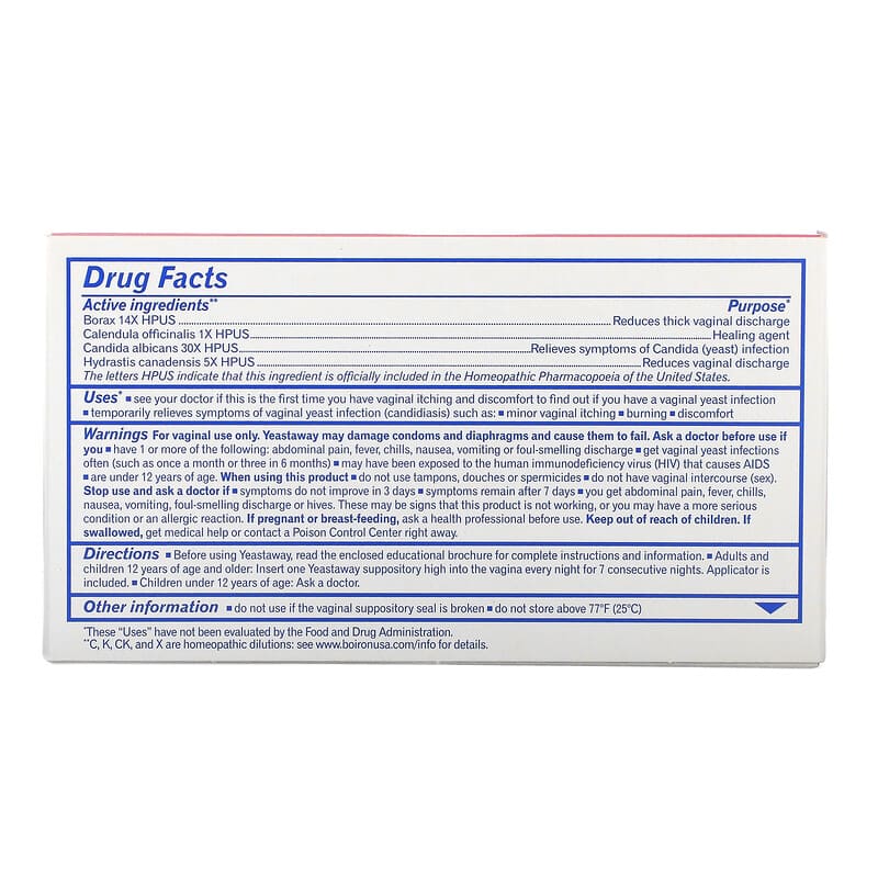 Minor Vaginal ItchingBurningDiscomfortHelp Your Body the Natural WayWorld Leader in Homeopathic MedicinesApplicator Included – Educational Brochure EnclosedUse Yeastaway® as the First Sign of a Yeast InfectionThe Boiron Promise A Boiron, we believe there’s a better way to feel good. A better way that works naturally with your body. Since 1932, the Boiron family has been committed to providing homeopathic medicines. As world leader in homeopathic medicines, our passion is your total health. Our promise is your total satisfaction. UsesSee your doctor if this is the first time you have vaginal itching and discomfort to find out if you have a vaginal yeast infectionTemporarily relieves symptoms of vaginal yeast infection (candidiasis) such as:Minor vaginal itchingBurningDiscomfort