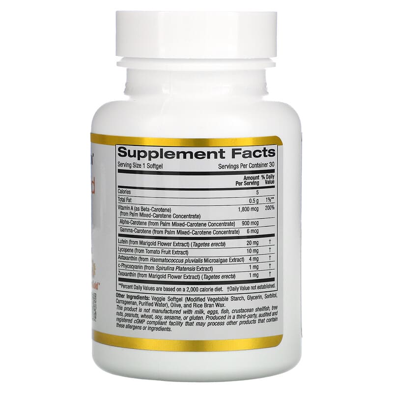 California Gold Nutrition AstaCarotenoid ComplexFeaturing Lutein, Lycopene, Astaxanthin, Zeaxanthin, and Phycocyanin plus Alpha, Beta and Gamma CarotenesFormulated with mGold™ Marigold Flower ExtractSupports Eye Health and Cellular Function*Suitable for Vegetarians and VegansFormulated without Gluten, GMOs, or Soy Produced in a 3rd Party Audited cGMP Registered (Certified) Facility100% Gold Guarantee