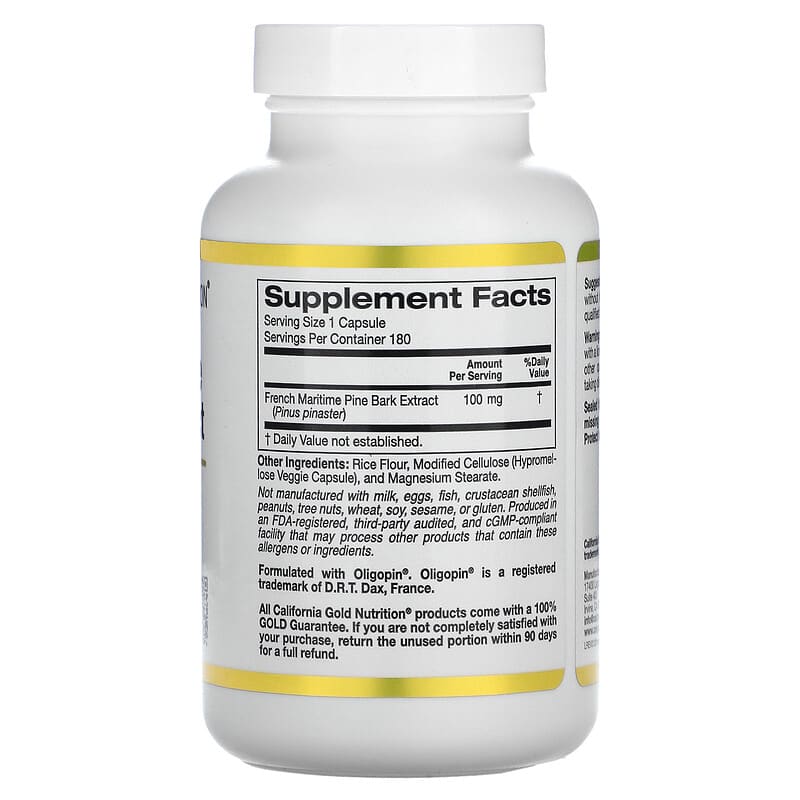 California Gold Nutrition French Maritime Pine Bark ExtractFormulated with Oligopin® French Pine Bark ExtractSupports Antioxidant, Cardiovascular, and Vasotonic Functions*Supports Free Radical Scavenging and Anti-Inflammatory Functions*Suitable for Vegetarians and VegansFormulated without Gluten, GMOs, or Soy Produced in a 3rd Party Audited cGMP Registered (Certified) Facility100% Gold Guarantee