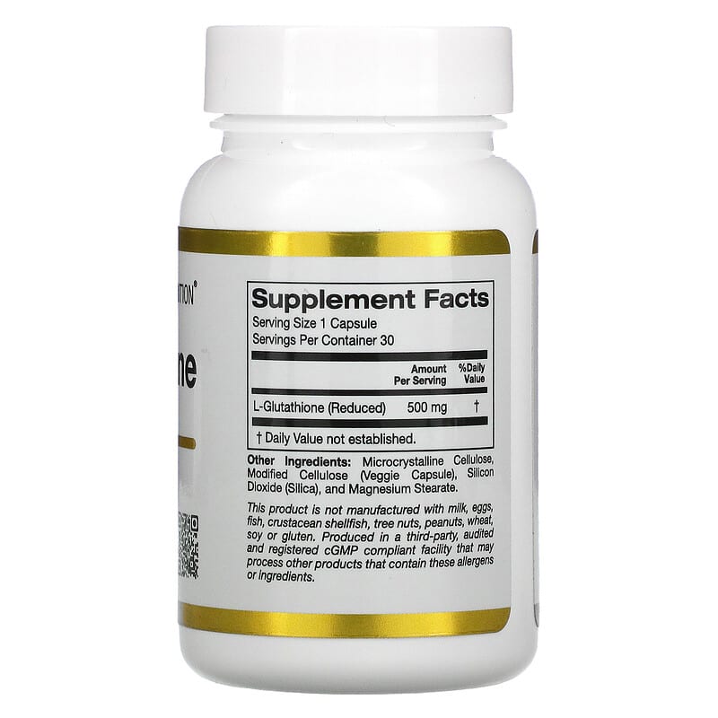 California Gold Nutrition L-Glutathione (Reduced)Featuring an Active (Reduced) Form of L-GlutathioneSupports Healthy Detoxification Processes*Supports Cellular Health and Immune Function*Formulated without Gluten, GMOs, or SoyProduced in a 3rd Party Audited cGMP Registered (Certified) Facility100% Gold Guarantee