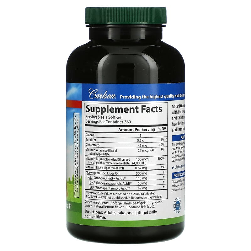 4000 IU (100 mcg) Vitamin D3 + Omega-3s Dietary Supplement Bone SupportImmune FunctionHeart Health360 ServingsGluten FreeNo Artificial PreservativesPotency & Quality GuaranteedAn FDA Regulated FacilityImpact Collective – Reduced Plastic ImpactProviding the Highest Quality Nutritional Supplements Since 1965Solar D Gems® blend vitamin D3 with the beneficial omega-3s EPA and DHA to promote strong bones, healthy immune system function, and heart health. Purity GuaranteedThis product is regularly tested by independent FDA registered laboratories. It has been determined to be fresh and fully potent (per AOCS international protocols) and is free of detrimental levels of mercury, cadmium, lead, PCBs and 28 other contaminants.