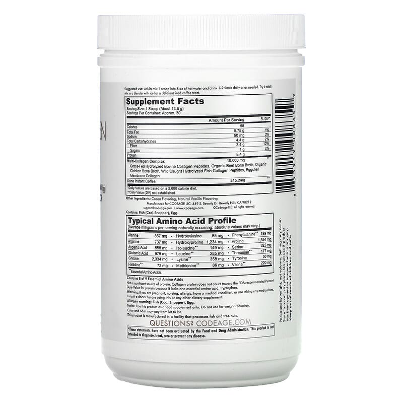 Thực phẩm chức năng Codeage Kona Coffee Multi Collagen Peptides 5 Types I II III V X Chocolate Mocha 14.39 oz (408 g) chính hãng nhập khẩu từ Mỹ, Mã vạch 853919008359, Quy cách: 0.51 kg, 14.39 oz