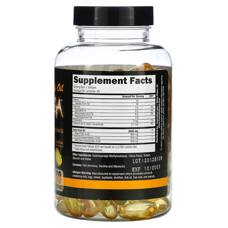 Hydroxypropyl methylcellulose, citrus flavor, gelatin, glycerin and water. Contains: Fish (anchovy, sardine and mackerel). Allergen Warning: Manufactured on equipment which processes products containing milk, egg, wheat, soybeans, shellfish, fish oil, tree nuts, and peanuts.