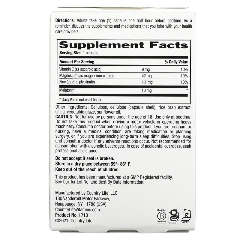 Established 1971Once-DailyCertified Gluten-FreeFall Asleep Faster and Support Your Immune SystemHelps Calm a Busy MindHelps with Muscle RelaxationGood Source of Antioxidants Zinc and Vitamin CClinically Tested Ingredient Dietary Supplement Convenient Blister PacksCertified B CorporationKosher ParveFeel Refreshed and Ready to #poweryourgreatness™- Our Pledge of Integrity -AuthenticityCleanlinessFreshnessConsistencyAccuracyYESCertified Gluten-Free by GFCO. OrgNOYeast or WheatYESCertified Vegan by the AVANOSoy, Milk or SaltYESRecyclable PackagingNOSugar or PreservativesYESManufacturing Supports Wind PowerNOArtificial Colors, Flavors or SweetenersYESKosher-ParveNOMagnesium StearateSleep is key when it comes to feeling your best! Country Life combines 10 mg of Melatonin, Magnesium, Zinc and Vitamin C, so you can fall asleep faster while supporting your Immune System. Did you know?The ingredients in this product support sleep and your immune system:Melatonin helps calm a busy mindMelatonin helps you fall asleep fasterMelatonin supports restorative sleepMagnesium helps with muscle relaxationMagnesium, Zinc, & Vitamin C support your immune system