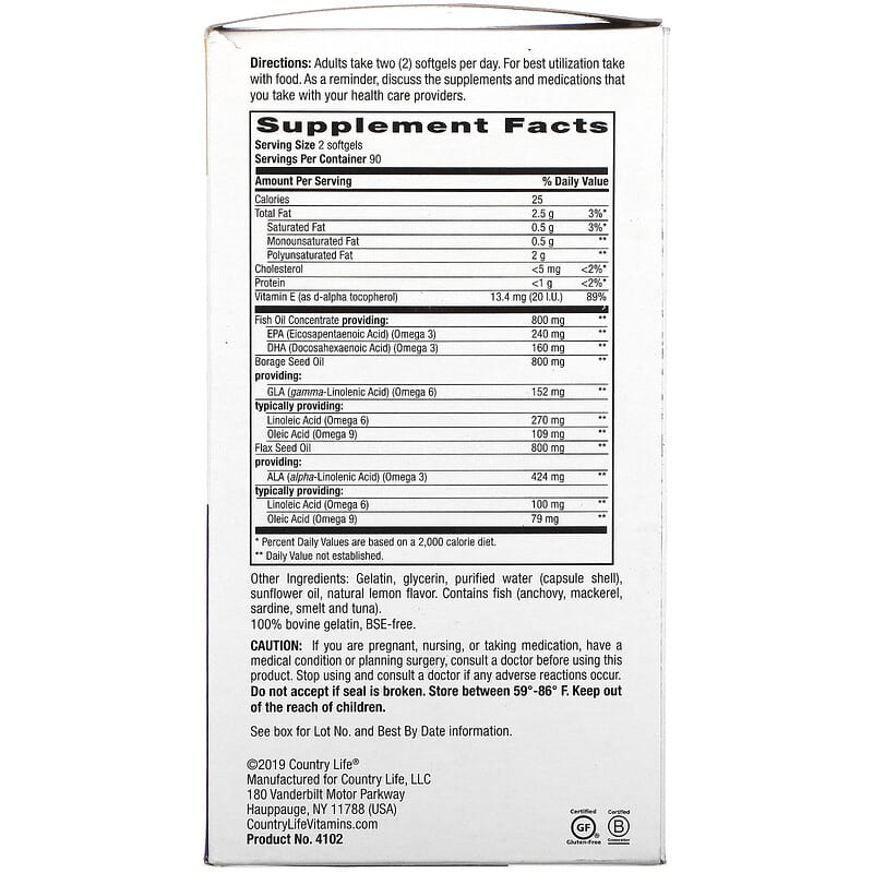 Established 1971Over 1, 500 mg of Omegas Per Serving Third Party Tested – Processed Using Molecular Distillation Dietary Supplement Certified B CorporationNo Fishy Taste – Our Pledge of Integrity – AuthenticityCleanlinessFreshnessConsistencyAccuracy2 Softgels Provide:Fish Oil 5 different sourcedBorage Seed OilFlax Seed OilHelps Support:Cardiovascular HealthBrain HealthSkin Health and Immune System HealthOver 1, 500 mg of Omega fatty acids from fish oil that has been processed using molecular distillation to ensure purity and from plant oils that are 100% expeller pressed without hexane or harsh chemicals. Omega 3: EPA, DHA, and Alpha-linolenic acidOmega 6: Essential fatty acid, Linoleic AcidOmega 9: Monosaturated fatty acid, Oleic Acid At Country Life, integrity is our #1 ingredient. Every product is rigorously tested to ensure it measures up against Country Life’s 5 Integrity Standards: 1) authenticity of ingredients; 2) cleanliness of ingredients; 3) freshness of ingredients; 4) consistency of the formula; and 5) accuracy of labeling. Omega-3 fatty acids supplementation helps to meet daily essential fatty acid (EFA) requirements and has shown promise in many areas. Cardio Health, Brain Health, Skin Health, Immune Health, Active Lifestyle. ALA – The body requires Alpha-linoleic acid (ALA) to make Omega-3 fatty acids, EPA and DHA. EPA – Precursor for hormone-like agents that regulates: Cell division & growth Blood clotting & muscle activity Secretion of digestive juices and hormones Movement of calcium in and out of cells DHA – Major fatty acid found in the brain Important for brain function Involved in signal transmission along neurons