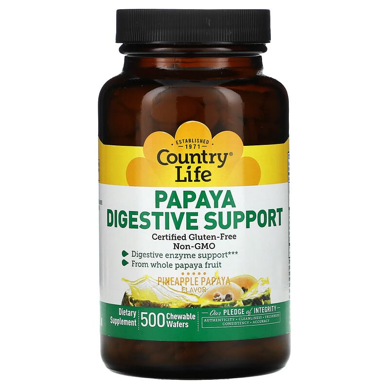 Established 1971Certified Gluten-FreeNon-GMODigestive Enzyme SupportFrom Whole Papaya Fruit Dietary Supplement Certified B Corporation Kosher – Our Pledge of Integrity – AuthenticityCleanlinessFreshnessConsistencyAccuracyDigestive enzymes, such as those naturally found in papaya, papain and protease, are essential to the body’s absorption of food nutrients. This chewable wafer has a delicious pineapple-papaya flavor – great after any meal. YESCertified Gluten-Free by GFCO. org