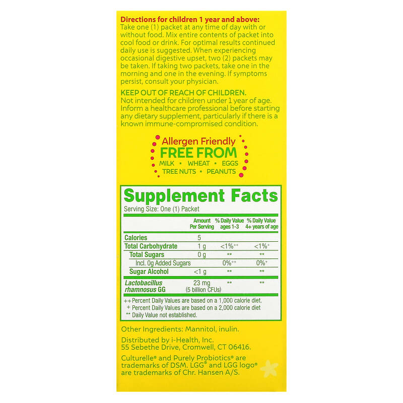 #1 Pediatrician Recommended Brand Helps Keep Kids HealthyHelps Supports Kids’ Immune & Digestive SystemsProbiotic SupplementNo Flavored AddedNaturally Sourced LGG®Most Researched Strain in Children†Guaranteed Purity & PotencyDairy – Gluten^ – Soy FreeThe Difference is Culturelle∞Culturelle® Kids Purely Probiotics® Packets are formulated to help keep your kids healthy & at their best, for whatever the day may bring. This product contains LGG® probiotic, the most clinically studied strain in children†, to help support both immune and digestive health. Supports Natural Immune DefensesBoost Digestive HealthOur Brand ValuesWe’re on a mission to inspire better health & wellness for you & your family. We believe in integrity, so we hold ourselves to the highest standards of truth. We believe in the natural power of your body’s microbiome, & in scientific research & products that will unlock its full potential. We believe in uncompromising quality, safety & proven efficacy. We believe in empowering you to embrace every day with confidence. †Based on the number of studies of Lactobacillus rhamnosus GG as of January 2019. ***Guaranteed potency through date on box when stored as directed. Based on a 2018 survey among pediatricians recommending a probiotic brand. ^Meets the FDA’s guidelines for gluten-free. ‡ Not a reduced calorie food. ∞Excludes gummy formulas.