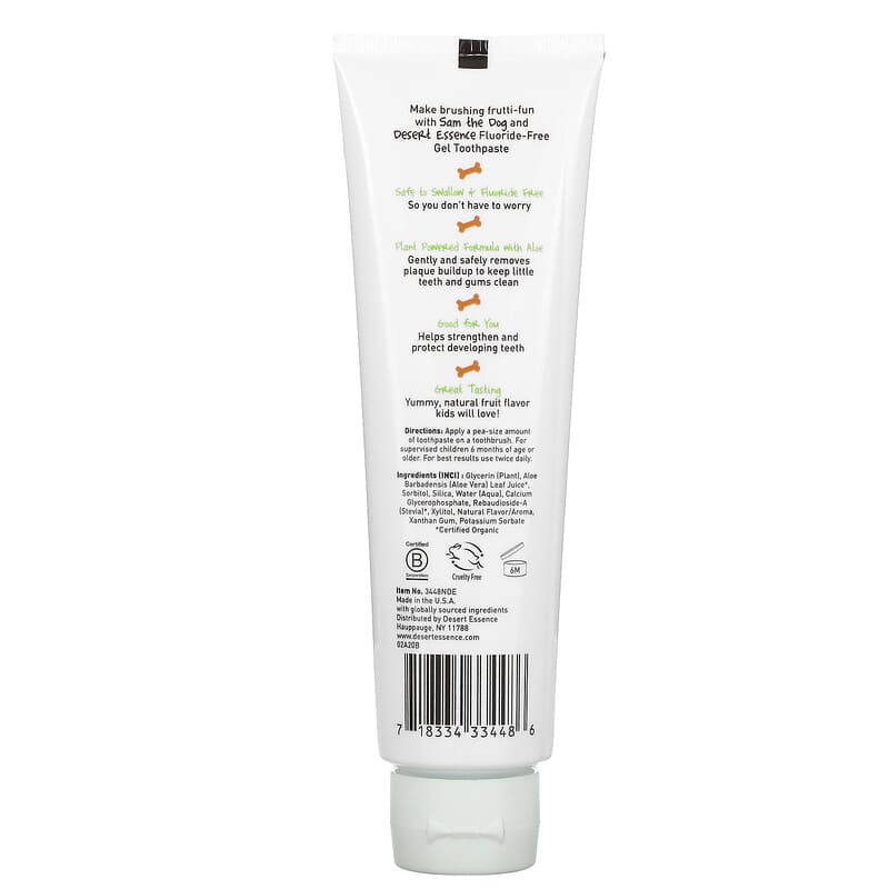 6 Months to 6 Years Carrageen Free Fluoride Free SLS Free Gluten Free Safe to Swallow Certified B Corporation Leaping Bunny Certified Cruelty Free Make brushing frutti-fun with Sam the Dog and Desert Essence Fluoride-Free Gel Toothpaste. Safe to Swallow + Fluoride Free So you don’t have to worry Plant Powered Formula with Aloe Gently and safely removes plaque buildup to keep little teeth and gums clean Good for You Helps strengthen and protect developing teeth Great Tasting Yummy, natural fruit flavor kids will love!