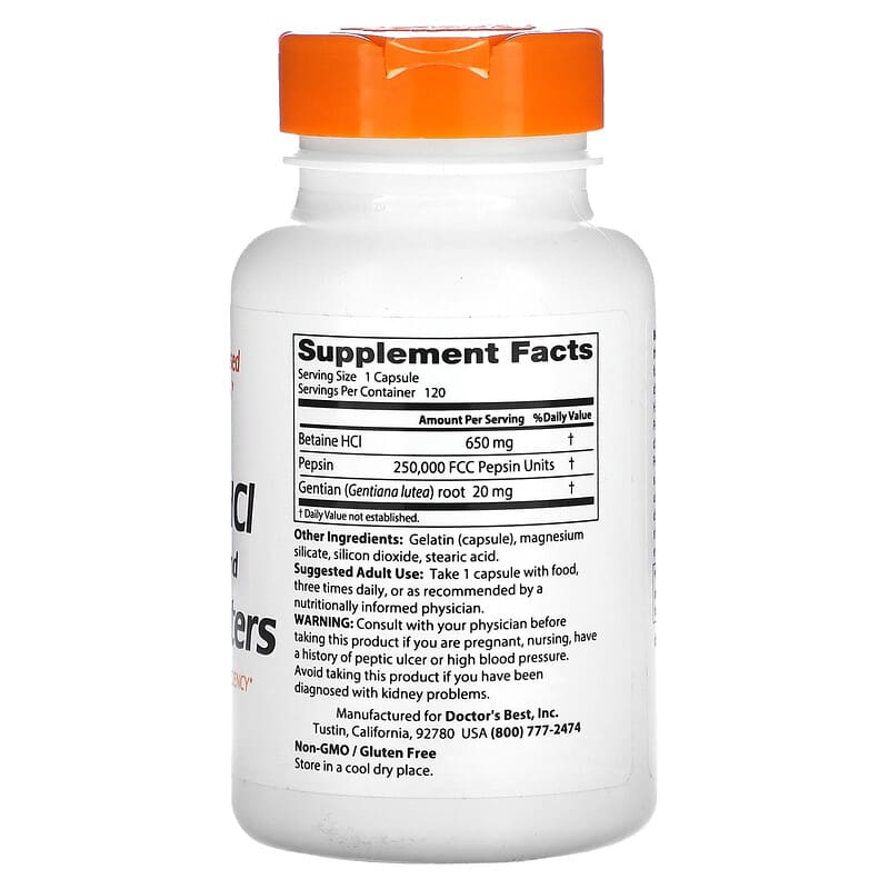 Thực phẩm chức năng Doctor's Best Betaine HCI Pepsin & Gentian Bitters 120 Capsules chính hãng nhập khẩu từ Mỹ, Mã vạch 753950001633, Quy cách: 0.14 kg,