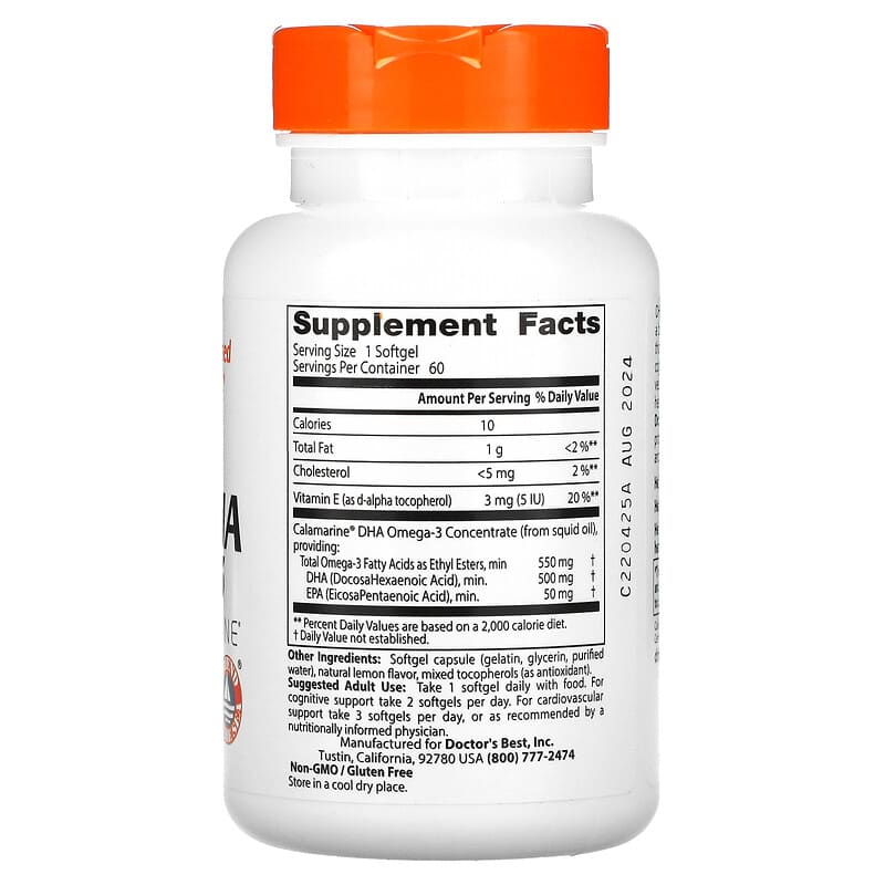 Science-Based Nutrition™ Helps Support Brain and Cardiovascular HealthFriend of the Sea®️ Dietary Supplement Non-GMO/Gluten FreeDHA (DocosaHexaenoic Acid, Omega-3) is a building block for the cell membranes that manage many vital processes, such as cognitive performance, heart and blood vessel health, vision, immunity, wound healing, and all major organ functions. Doctor’s Best Calamari DHA Omega-3 is produced from sustainably harvested squid, and molecularly distilled to ensure purity. Helps support cell, tissue and organ functionsHelps support cognitive performanceHelps support cardiovascular and overall health at life stages