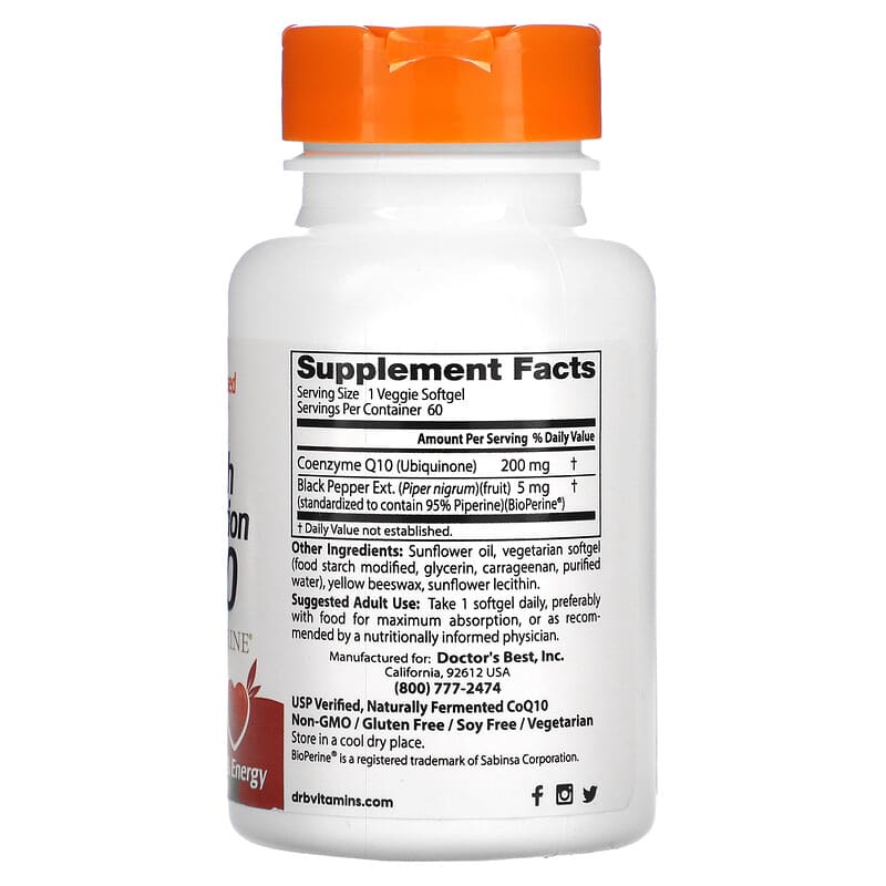 Thực phẩm chức năng Doctor's Best High Absorption CoQ10 with BioPerine 200 mg 60 Veggie Softgels chính hãng nhập khẩu từ Mỹ, Mã vạch 753950004122, Quy cách: 0.07 kg, 60 viên