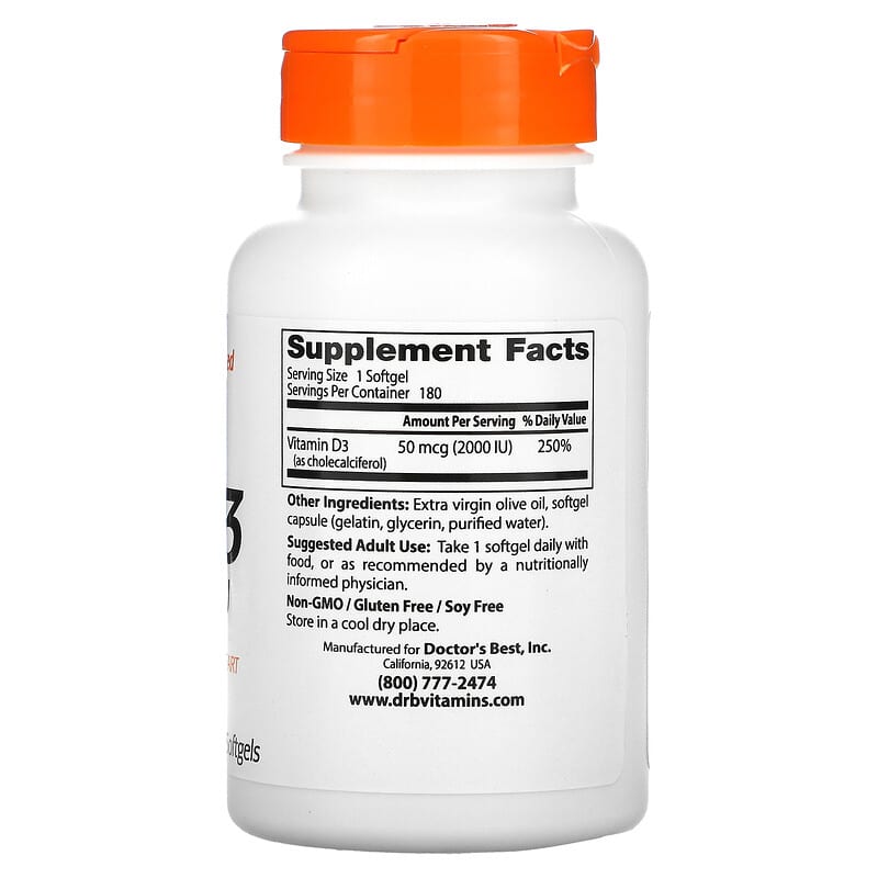 Thực phẩm chức năng Doctor's Best Vitamin D3 50 mcg (2.000 IU) 180 Softgels chính hãng nhập khẩu từ Mỹ, Mã vạch 753950002104, Quy cách: 0.07 kg, 180 viên