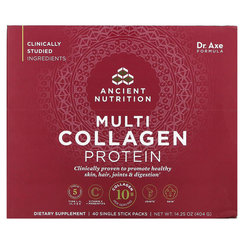 Clinically Studied Ingredients Dr. Axe FormulaClinically Proven to Promote Healthy Skin, Hair, Joints & Digestion 5 Types of Food Source Collagen – Type I, II, III, V and XVitamin C + Probiotics Collagen 10 g Per Serving Joints Skin Gut Nails Hair Grass-Fed Pasture Raised Non GMO Dietary Supplement Clinically-studied source of Types V and X collagen to improve crow’s feet after 4 weeks. Clinically-studied source of Types V and X collagen to reduce joint discomfort in 7 days. Ancient Nutrition transforms your health and vitality with history’s healthiest whole food nutrients. Our Multi Collagen Protein is uniquely formulated with 5 types of food source collagen that are clinically proven to promote healthy hair, skin, joints and digestion.
