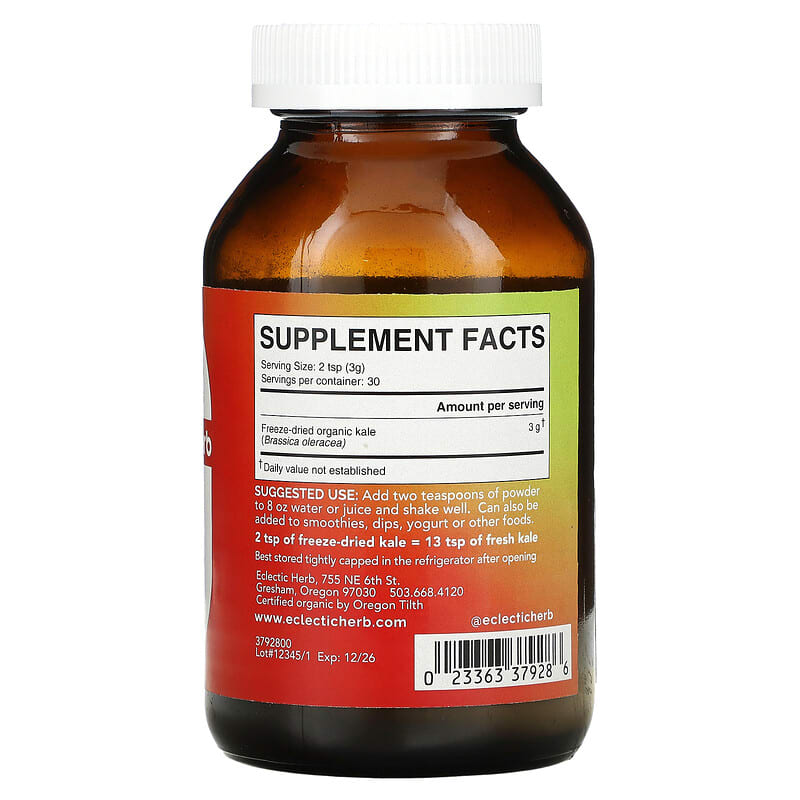 Eclectic HerbFor Peak Plant Power Dietary Supplement USDA OrganicNutrient DenseWhole HerbsGluten FreeRawUS GrownVeganSoy FreeNon GMO100% KosherConcentrated 6 1/2 X Through Freeze-Drying2 tsp of Freeze-Dried Kale = 13 tsp of Fresh KaleCertified Organic by Oregon TilthFreeze Dried Fresh For Peak Plant PowerOur Kale is locally grown and fresh freeze-dried in-house in small batches. Freeze-drying is the best method of preservation as it naturally concentrates the nutrients in the plant by removing only the water. Nothing artificial – no fillers, sweeteners, additives or preservatives.