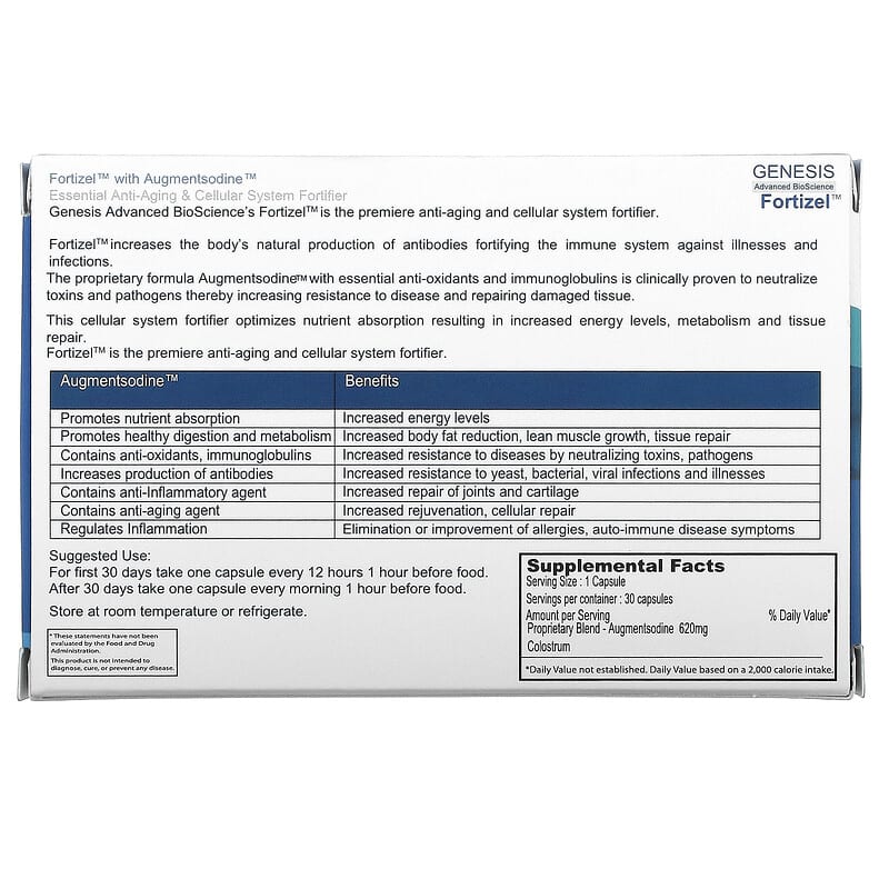Since 19936 HourGuaranteed for Purity, Freshness & PotencyFortizel™ with Augmentsodine™Essential Anti-Aging & Cellular System FortifierGenesis Advanced BioScience’s Fortizel™ is the premiere anti-aging and cellular system fortifier. Fortizel™ increases the body’s natural production of antibodies fortifying the immune system against illnesses and infections. The proprietary formula Augmentsodine™ with essential anti-oxidants and immunoglobulins is clinically proven to neutralize toxins and pathogens thereby increasing resistance to disease and repairing damaged tissue. This cellular system fortifier optimizes nutrient absorption resulting in increased energy levels, metabolism and tissue repair. Fortizel™ is the premier anti-aging and cellular system fortifier. Augmentsodine™BenefitsPromotes nutrient absorptionIncreased energy levelsPromotes healthy digestion and metabolismIncreased body fat reduction, lean muscle growth, tissue repairContains anti-oxidants, immunoglobulinsIncreased resistance to diseases by neutralizing toxins, pathogensIncreased production of antibodiesIncreased resistance to yeast, bacterial, viral infections and illnessesContains anti-inflammatory agentIncreased repair of joints and cartilageContains anti-aging agentIncreased rejuvenation, cellular repairRegulates inflammationElimination or improvement of allergies, auto-immune disease symptoms