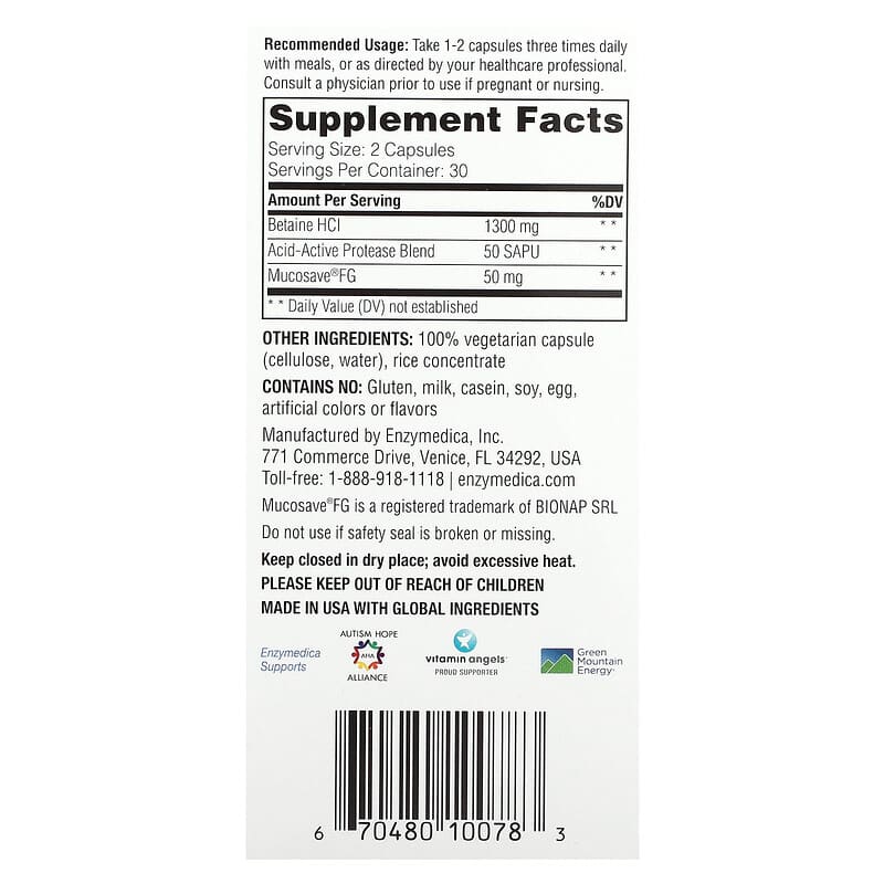 Cách sử dụng Enzymedica Fast-Acting Betaine HCI 60 Capsules