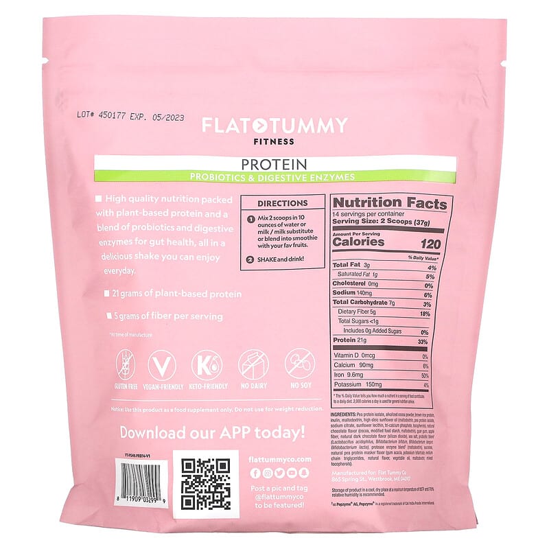 Thực phẩm chức năng Flat Tummy Fitness Protein Drink Mix Probiotics & Digestive Enzymes Natural Chocolate 18.27 oz (518 g) chính hãng nhập khẩu từ Mỹ, Mã vạch 811909032999, Quy cách: 0.55 kg,