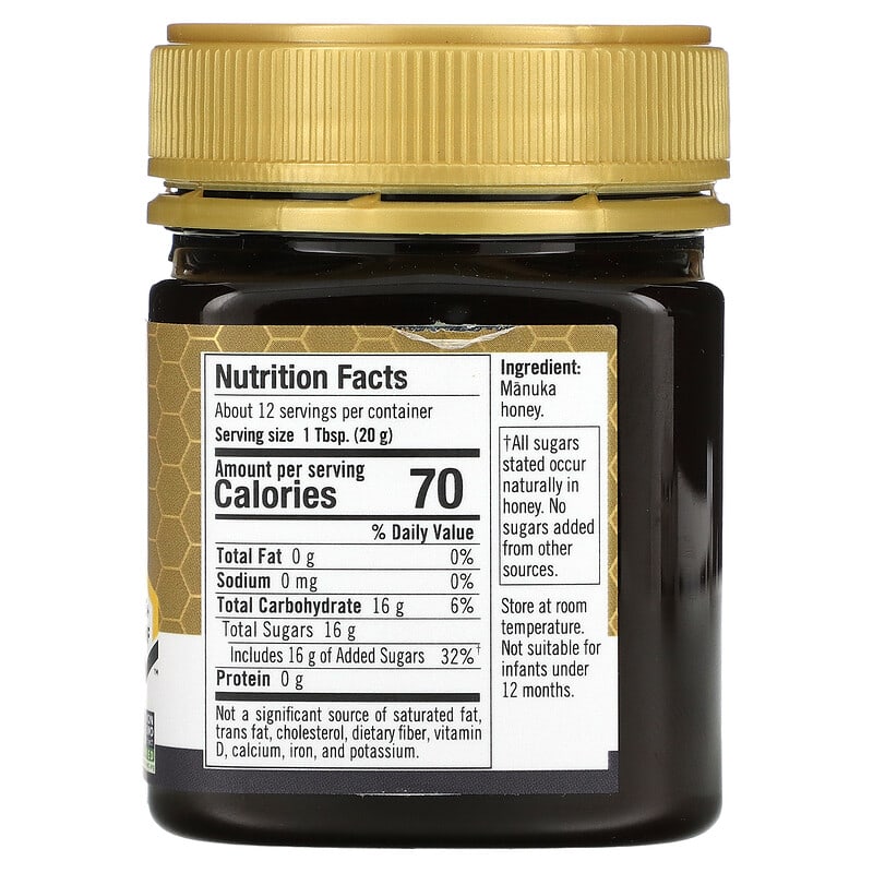 | Not a significant source of saturated fat, trans fat, cholesterol, dietary fiber, vitamin D, calcium, iron, and potassium. †All sugars stated occur naturally in honey. No sugars added from other sources. |