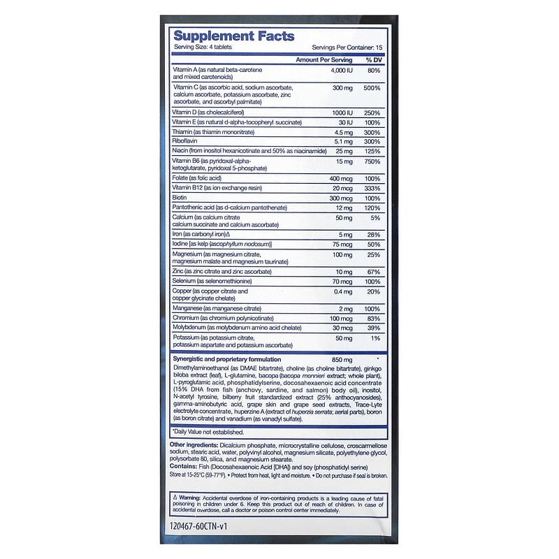 | Synergistic and proprietary formulation Dimethylaminoethanol (as DMAE bitartrate), choline (as choline bitartrate), ginkgo biloba extract (leaf), L-glutamine, bacopa (bacopa monnieri extract; whole plant), L-pyroglutamic acid, phosphatidylserine, docosahexaenoic acid concentrate (15% DHA from fish (anchovy, sardine, and salmon) body oil), inositol, N-acetyl tyrosine, bilberry fruit standardized extract (25% anthocyanosides), gamma-aminobutyric acid, grape skin and grape seed extracts, Trace-Lyte electrolyte concentrate, huperzine A (extract of huperzia serrata; aerial parts), boron (as boron citrate) and vanadium (as vanadyl sulfate). |
