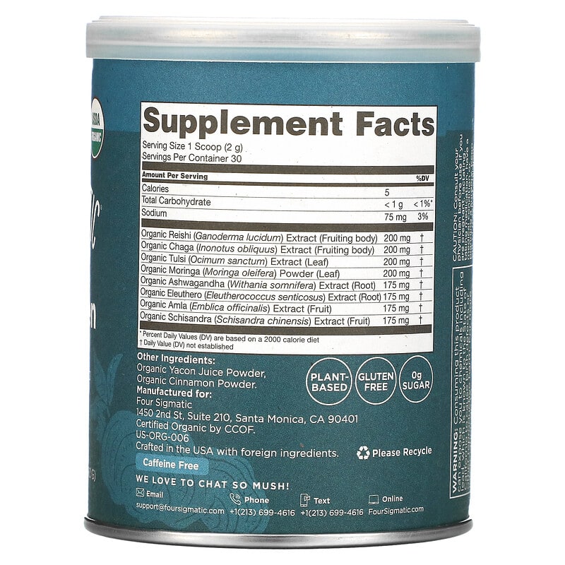 USDA OrganicWith Stress Supporting Adaptogens Dietary Supplement 30 ServingsPlant BasedGluten Free0% SugarCertified Organic by CCOFCaffeine FreeRigorously Lab-Tested1500 mg Adaptogens Per ServingFlavor: Earthy + CinnamonYour Daily Balancing ActTraffic? Mondays? We can’t make it fun, but Adaptogens help you to balance the demands of your busy life. Go from OMG to OM with one scoop.