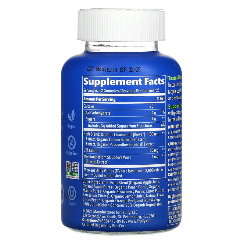 Real Fruit Gummy‡VeganGluten FreeNon GMO Project Verified Kosher Dietary Supplement Certified Organic by Pro-Cert ‡Tastes Like Real Fruit because it´s made with real fruit (apple, peach, strawberry, mango and lemon juice/puree). Supports Healthy Sleep with plant-source melatonin, herbs and theanine.