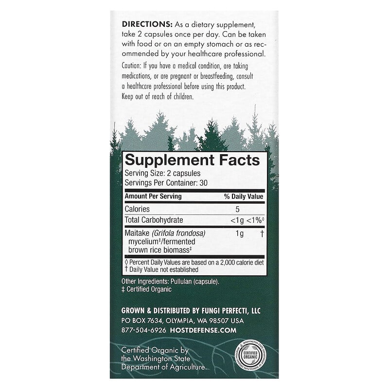 Made With Organic Mushroom MyceliumNon GMOGluten Free & VeganCertified Organic by the Washington State Department of Agriculture Dietary Supplement Supports Healthy Blood Sugar Already in the Normal Range#1 Best-Selling Mushroom Brand in the US♢Bee FriendlyEco PackagingMaitake (Grifola frondosa) Maitake supports an engaged and balanced immune response, cellular health, and healthy blood sugar levels already within the normal range. Supports blood sugar levels already within the normal range. Promotes metabolic wellness and a healthy glycemic balance. Supports cellular health. Supports a balanced immune response. Powered by Mushroom Mycelium Fungi Perfecti-makers of Host Defense Mushrooms-was founded by renowned mycologist Paul Stamets to build a bridge between people and fungi. We specialize in mycelium-based supplements for immune support and whole-body wellness. Sustainably grown in the USA, our mushroom mycelium is cultured on organic brown rice. Host Defense® formulations are based on scientifically validated data to ensure quality and safety. ♢Source: SPINSscan Natural / Natural Products Supermarkets > $2MM / Total US – Natural Channel / Mushrooms Ingredient Report / 52 Wks Ending 9/5/2021
