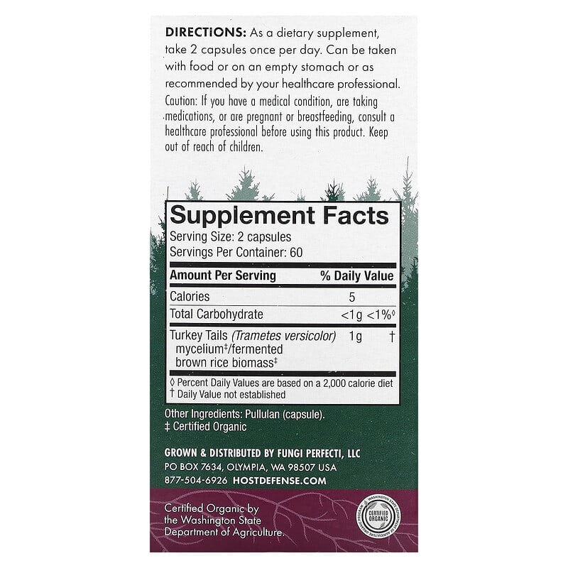 Prebiotic for the Microbiome Made with U. S Grown Organic Mushrooms Mycelium Gluten FreeNon GMO Project Verified Dietary Supplement Certified Organic by the Washington State Department of AgricultureFrom the Forest, to our Farm, to You™ Host Defense® Turkey TailPredominant in woodlands throughout the world, Turkey Tail is one of the best-documented mushrooms in medical research. With a wide spectrum of beneficial properties, Turkey Tail shows much promise in supporting the immune system with its protein-bound and unique polysaccharides. Turkey Tail mushroom mycelium supports beneficial microflora in the digestive and gastrointestinal ecosystem. Host Defense® Turkey Tail uses activated, optimally dried, Certified Organic mushroom mycelium, with a full spectrum of constituents: >55% (550 mg/serving) polysaccharides and an array of extracellular constituents, including prebiotics for the microbiome, essential for Supporting Natural Immunity. Host Defense® is the #1 Best-Selling Mushroom Brand in the U. S. :The Highest Quality and Scientifically ValidatedGuaranteed, accurate identity of each mushroomNon-GMO verified ingredientsHeat treated to proper temperature to ensure safety & bioavailabilityProduced under the direct supervision of Paul Stamets, D. Sc. Bee Friendly