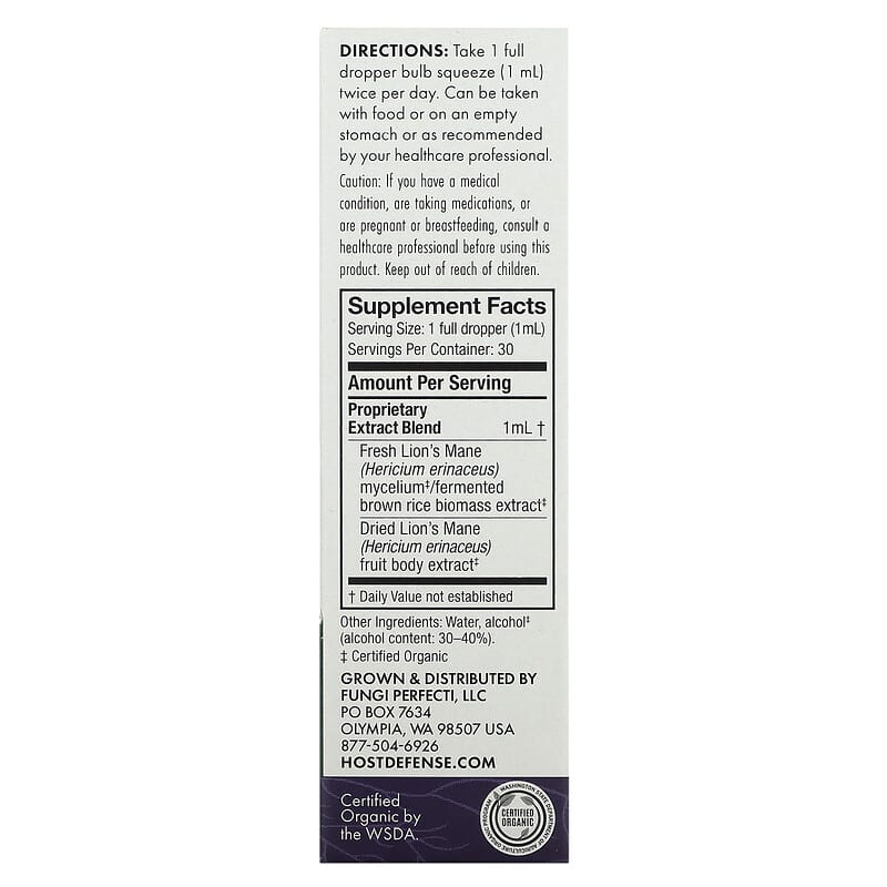 Host Defense® Mushrooms™Superfood Mushroom MyceliumGluten Free & Vegan Dietary Supplement USDA OrganicCertified Organic by the Washington State Department of AgricultureBee Friendly Non GMOPaul Stamets Fungi Perfecti, LLCEco Packaging#1 Best-Selling Mushroom Brand in the U. S. ♢ Fungi Perfecti -makers of Host Defense Paul Mushrooms – was founded by renowned mycologist Paul Stamets to build a bridge between people and fungi. We specialize in mycelium- based supplements for immune support and whole-body wellness. Sustainably grown in the USA, our mushroom mycelium is cultured on organic brown rice. Host Defense formulations are based on scientifically validated data to ensure quality and safety. Lion’s Mane (Hericium erinaceous)Memory & Nerve SupportKnown as “The Smart Mushroom”, Lion’s Mane is ideal for anyone seeking cognition, memory, and mood support. Long-renowned for supporting the nervous system, studies also show that Lion’s Mane can increase Nerve Growth Factor. Made with triple-extracted, organic mushroom mycelium and fruit bodies grown in the USA. Lion’s ManePromotes mental clarity, focus, and memory. Supports a balanced mood. Promotes nervous system health. Supports a balanced immune response. ♢SPINSscan Natural Enhanced Channel/ 52 Wks Ending 3/20/2022