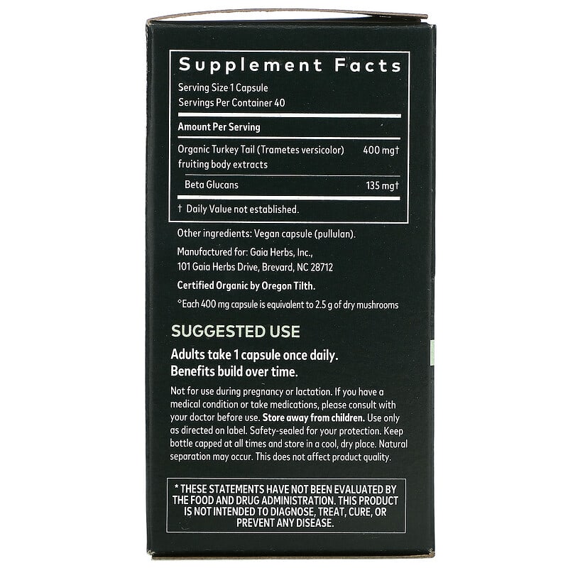 Sản phẩm Gaia Herbs Turkey Tail Mushroom 40 Vegan Capsules không phải là thuốc và không có tác dung thay thế thuốc chữa bệnh. Bạn nên hỏi ý kiến của Bác sĩ hoặc Chuyên gia dinh dưỡng khi sử dụng.