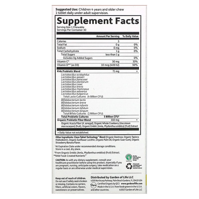 Thành phần có trong Garden of Life Dr. Formulated Probiotics Organic Kids + Tasty Organic Strawberry Banana 30 Yummy Chewables