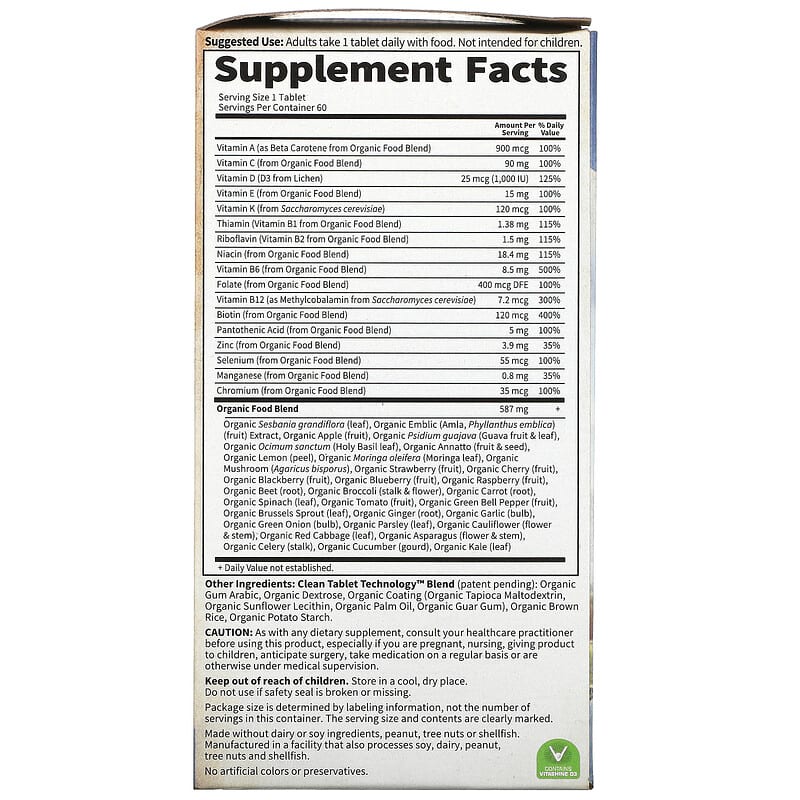Certified Organic Whole FoodWhole Food MultivitaminUSDA OrganicNon GMO Project VerifiedKosherWhole Food SupplementWhole Foods from Organic Farms No Magnesium Stearate (Vegetable Lubricant) Certified Organic by QCSContains Vitashine D3Over 30 Organic Family Farmed foods Certified Organic – Farmed without the use of toxic pesticides and fertilizers. Non-GMO Verified – Independent third party verification. Certified Gluten-Free by NSFVegan Certified – Third party certified by Vegan Action Whole Food Multi that’s certified organic, Non-GMO verified, from real, nutritious foods. Men Once Daily Whole Food Multivitamin formulated for Men. Health, Strength, Endurance – Promotes sustained energy, while supporting a healthy metabolism and heart. Real Food Formula – Made from over 30 powdered fruits, vegetables and herbs.
