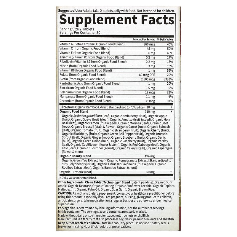 Certified Organic Whole FoodCertified USDA OrganicWhole Food From Organic FarmsNo Magnesium StearateVegetable LubricantSupport For Beautiful Hair, Skin & NailsNon GMO Project VerifiedKosherWhole Food SupplementCertified Organic by QCSOver 30 Organic Family Farmed foodsCertified Organic – Farmed without the use of toxic pesticides and fertilizers Non GMO Verified – Independent, third party verification Vegan Certified – Third party certified by Vegan Action Certified Gluten Free By NSF Whole Food formula with Biotin and Silica that’s certified organic and Non-GMO verified from real, nutritious foods. Beautiful Hair, Skin and NailsHelps restore and maintain youthful levels of Collagen, Keratin and Elastin, three proteins responsible for promoting your body’s healthy, natural glowOrganic Beauty BlendWith Bamboo Silica, Pomegranate, Green & Rooibos Tea, Citrus Bioflavonoids & TurmericReal Food FormulaMade from over 30 powdered organic fruits, vegetables and botanicals.