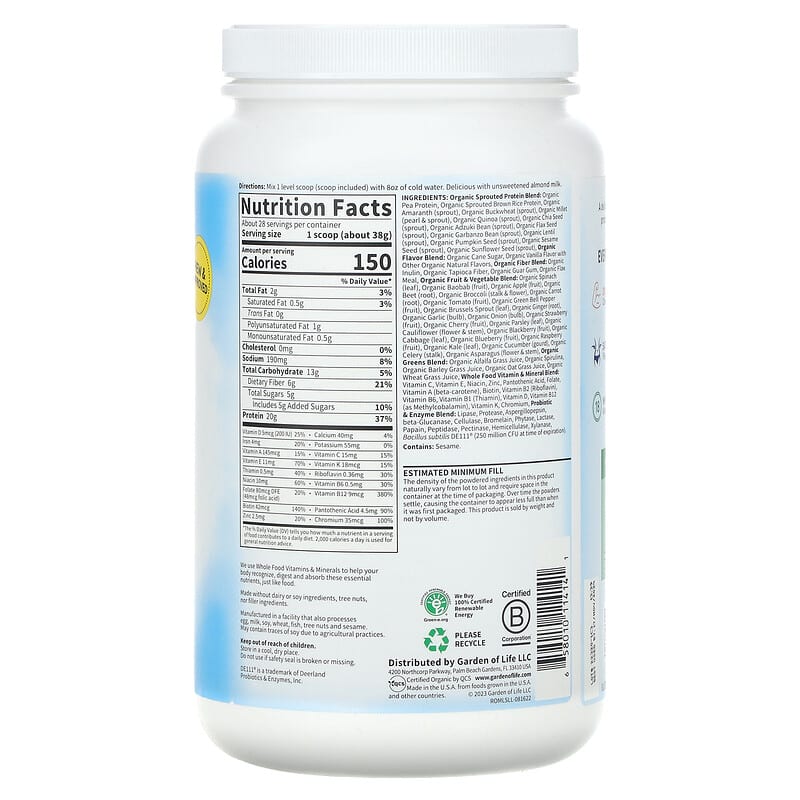 Organic sprouted protein blend: Organic pea protein, organic sprouted brown rice protein, organic amaranth (sprout), organic buckwheat (sprout), organic millet (pearl & sprout), organic quinoa (sprout), organic chia seed (sprout), organic adzuki bean (sprout), organic flax seed (sprout), organic garbanzo bean (sprout), organic lentil (sprout), organic pumpkin seed (sprout), organic sesame seed (sprout), organic sunflower seed (sprout), Organic fiber blend: Organic tapioca fiber, organic chia seed, organic flax meal, Organic flavor blend: Organic cane sugar, organic vanilla flavor, Organic fruit & vegetable blend: Organic spinach (leaf), organic baobab (fruit), organic apple (fruit), organic beet (root), organic broccoli (stalk & flower), organic carrot (root), organic tomato (fruit), organic green bell pepper (fruit), organic brussels sprout (leaf), organic ginger (root), organic garlic (bulb), organic onion (bulb), organic strawberry (fruit), organic cherry (fruit), organic parsley (leaf), organic cauliflower (flower & stem), organic blackberry (fruit), organic cabbage (leaf,) organic blueberry (fruit), organic raspberry (fruit), organic kale (leaf), organic cucumber (gourd), organic celery (stalk), organic asparagus (flower & stem), Organic greens blend: Organic alfalfa grass juice, organic spirulina, organic barley grass juice, organic oat grass juice, organic wheat grass juice, Whole food vitamin & mineral blend [from culture of saccharomyces cerevisia: vitamin C, niacin, pantothenic acid, folate, vitamin A (beta – carotene), biotin, vitamin B2 (riboflavin), vitamin B6, vitamin B1 (thiamin), vitamin D, vitamin B12 (as methylcobalamin), vitamin K], vitamin E (from sunflower oil), zinc and chromium (from brown rice chelate), Probiotic & enzyme blend: Lipase, protease, aspergillopepsin, beta – glucanase, cellulase, bromelain, phytase, lactase, papain, peptidase, pectinase, hemicellulase, xylanase, [lactobacillus plantarum, lactobacillus bulgaricus] (1. 5 billion CFU). Made without dairy or soy ingredients, tree nuts, filler ingredients, nor artificial colors, flavors, sweeteners or preservatives. Manufactured in a facility that also processes egg, milk, soy, wheat, fish and tree nuts. May contain traces of soy due to agricultural practices.