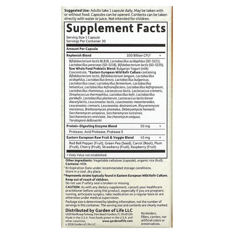 Store in a cool, dry place. ^Represents strains typically found in Eastern European Wild Kefir Culture. Keep out of reach of children. Do not use if safety seal is broken or missing. As with any dietary supplement, consult your healthcare practitioner before using this product, especially if you are pregnant, nursing, anticipate surgery, take medication on a regular basis or are otherwise under medical supervision.