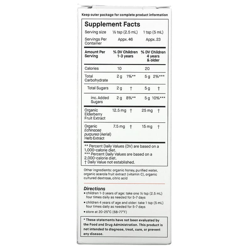 Keep outer package for complete product information. Do not use if child is allergic or sensitive to any of the ingredients. As with any new product, consult your healthcare professional before giving to your child. If a fever develops or if symptoms last for more than 24 hours, consult your doctor. If your child seems to be having difficulty breathing, contact your doctor immediately. Keep out of reach of children. Store between 20-25ºC(68-77ºF). Bottle is safety sealed. Do not use if bottle seal is disturbed or missing. Store at 20-25ºC (68-77ºF).
