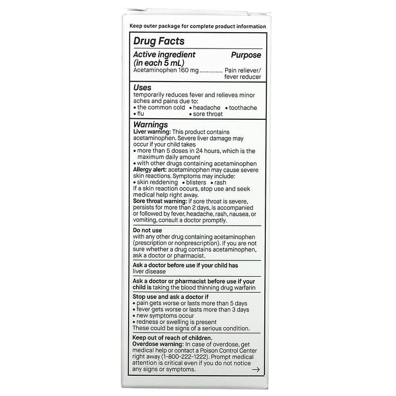 Keep outer package for complete product information. Liver warning: This product contains acetaminophen. Severe liver damage may occur if your child takes more than 5 doses in 24 hours, which is the maximum daily amount with other drugs containing acetaminophen Allergy alert: Acetaminophen may cause severe skin reactions. Symptoms may include:Skin reddeningBlistersRashIf a skin reaction occurs, stop use and seek medical help right away. Sore throat warning: If sore throat is severe, persists for more than 2 days, is accompanied or followed by fever, headache, rash, nausea, or vomiting, consult a doctor promptly. Do not use with any other drug containing acetaminophen (prescription or nonprescription). If you are not sure whether a drug contains acetaminophen, ask a doctor or pharmacist. Ask a doctor before use if your child has liver disease. Ask a doctor or pharmacist before use if your child is taking the blood thinning drug warfarin. Stop use and ask a doctor ifPain gets worse or lasts more than 5 daysFever gets worse or lasts more than 3 days New symptoms occurRedness or swelling is present These could be signs of a serious condition. Keep out of reach of children. Overdose warning: In case of overdose, get medical help or contact a Poison Control Center right away. Prompt medical attention is critical even if you do not notice any signs or symptoms. Store between 20-25ºC(68-77ºF). Bottle is safety sealed. Do not use if bottle seal is disturbed or missing.