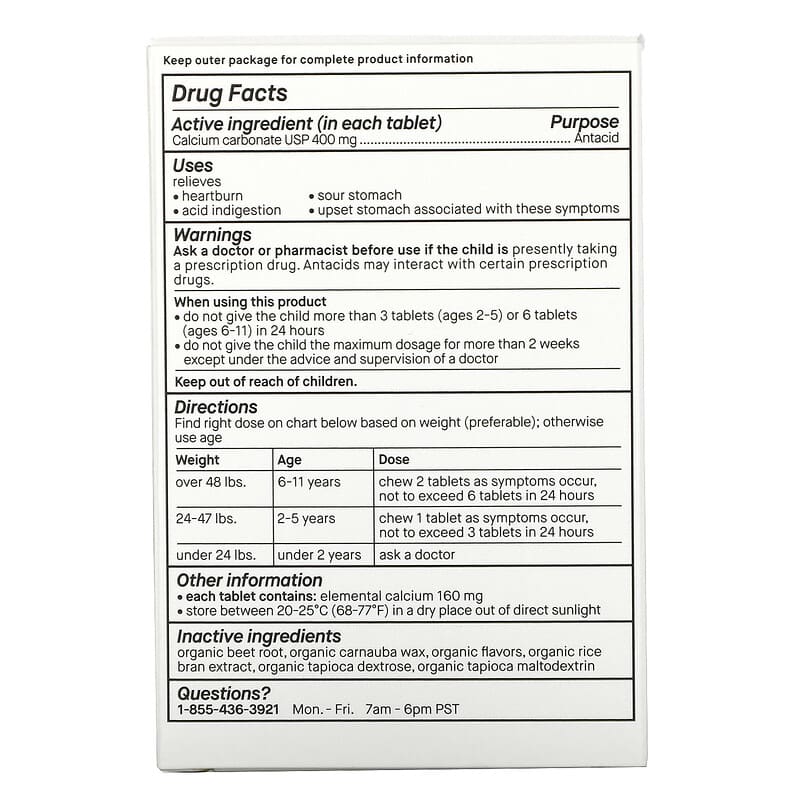 Keep outer package for complete product information. Ask a doctor or pharmacist before use if the child is presently taking a prescription drug. Antacids may interact with certain prescription drugs. When using this productDo not give the child more than 3 tablets (ages 2-5) or 6 tablets (ages 6-11) in 24 hours. Do not give the child the maximum dosage for more than 2 weeks except under the advice and supervision of a doctor. Keep out of reach of children. Each tablet contains: elemental calcium 160 mg. Store between 20-25ºC (68-77ºF) in a dry place out of direct sunlight. Bottle is safety sealed. Do not use if bottle seal is disturbed or missing.