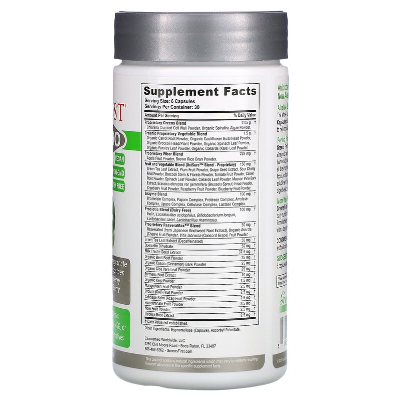 VeganNon-GMOGluten FreeVitalize – Energize – Rejuvenate8 + Serving of Fruits & Vegetables**54 Different Super FoodsAntioxidants, Probiotics EnzymesNo Wheat, Dairy, MSG or Preservatives Pro Formula Enhanced With:PomegranateMangosteenAcai BerryGoji BerryNoniAntioxidant Power 54 Different Super Foods… Now Available in Convenient CapsulesAlkalize • Energize • RevitalizeThe whole food, plant-based nutrition found in Green First Pro® Capsules delivers powerful phytonutrients, antioxidants and more to help nourish, alkalize and balance your whole body. Perfect For Busy Families On The Go!Green First Pro® Capsules begin at local farms, orchards & vineyards across the country. Then, the fruits & vegetables are harvested, cleaned, juiced and dried at low temperatures leaving all the important nutrients & enzymes intact. We add other super foods, extracts, concentrates including super greens, probiotics, soluble and insoluble fibers, herbs, spices, natural flavonoids and digestive enzymes all wrapped up in convenient capsules!Mom Was Right- Eat Your Fruit & Vegetables!Greens First Pro® Capsules are part of a healthy diet supplying daily nutrition that you may otherwise not be getting. Our premium formula helps to rebalance & rejuvenate your body and your health with a daily serving of nutritional goodness. **Based on ORAC Testing