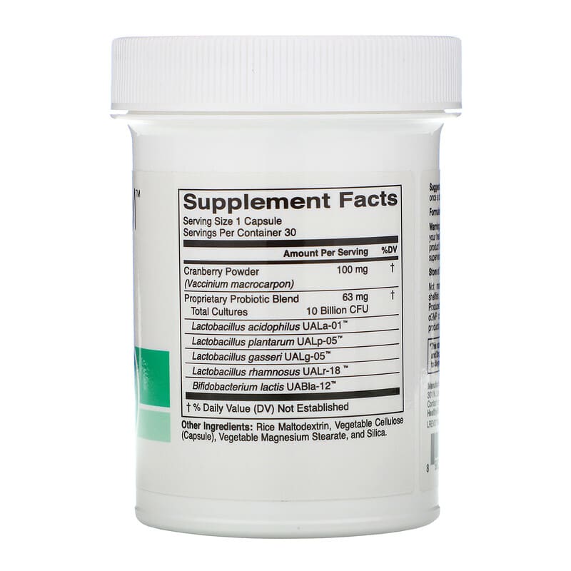Cranberry Powder (Vaccinium macrocarpon), and Proprietary Probiotic Blend (Lactobacillus acidophilus UALa – 01™, Lactobacillus plantarum UALp – 05™, Lactobacillus gasseri UALg – 05™, Lactobacillus rhamnosus UALr – 18™, Bifidobacterium lactis UABla – 12™). – Thành phần khác: