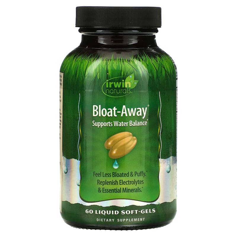 Supports Water BalanceFeels Less Bloated & PuffyReplenish Electrolytes & Essential Minerals Dietary Supplement No Preservatives AddedBloat-Away: Feel less bloated and puffy with water balance support. Bloat-Away® is specially formulated to support the body’s natural water balance. Botanical Blend: Bloat-Away delivers a targeted blend of botanicals, including Cranberry, Dandelion leaf and Juniper berry. Electrolyte Support: Bloat-Away is enhanced with Potassium and nutrient-dense herbs to help replenish electrolytes and essential minerals in the body. Antioxidant Support: Bloat-Away supplies botanicals with known antioxidant activity to help fight free radicals and support cellular health. What makes us different:Liquid Soft-Gels – The nutrients in these easy-to-swallow Liquids Soft-Gels are released fast. Other forms of delivery can contain binders and fillers that may cause stomach upset and offer no nutritional value. Advanced Liquid Soft-Gels provide an optimum delivery system. Quality Assurance – Irwin Naturals® is committed to providing the highest quality products for your health. We employ compliance testing to ensure purity and potency. Patented BioPerine® – Our BioPerine Complex enhances the bioavailability, absorption and potency of many nutrients.