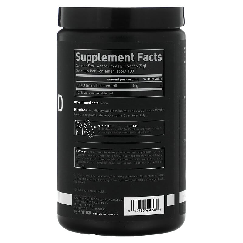 Muscle Recovery Dietary Supplement 5 Grams L-GlutamineVegan FriendlyNon GMOGluten FreeInformed Sport – Banned Substance Tested Every BatchImprove RecoveryFight FatigueQuick AbsorptionMix Your Own SystemMicroPure® Quality GuaranteeThird-Party Tested for Purity and PotencyNever Stop EvolvingWhat is Glutamine?Glutamine is the most abundant amino acid in the human body. It’s essential for muscle protein synthesis, post-workout fatigue, and recovery. When your body is depleted of glutamine, such as after an intense workout, you’ll want to restore your glutamine levels right afterward to help with muscle protein synthesis and reduce muscle breakdown. Why Kaged BCAAS?Many glutamine supplements on the market are from shellfish, human hair, and bird feathers which are not the best sources of L-Glutamine. Fermented L-Glutamine is the purest L-Glutamine you can buy. It’s vegan, non-GMO, and third-party tested. Cheaply priced glutamine is generally indicative of low-quality raw materials used in manufacturing. With Micropure Glutamine by Kaged®, you can be assured that you are getting high-quality free-form glutamine. We are Kaged. We are Kaged, the elite supplement brand. We provide you with the highest quality formulas in the world to help you lift heavier, be healthier, and evolve into the strongest version of yourself.